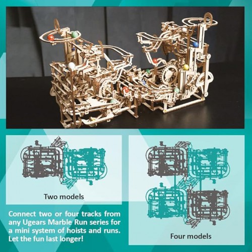 The Spiral Hoist is part of the UGEARS Marble Run series, designed so that all models – Spiral, Chain, Tiered, and Stepped Hoists – can interconnect.