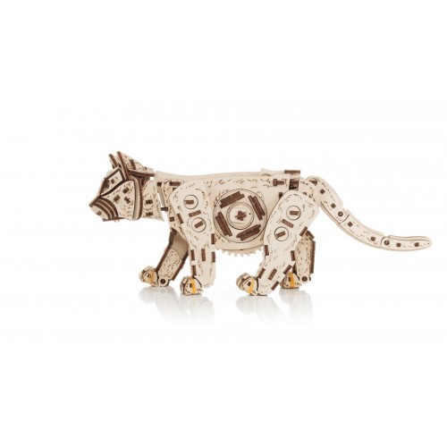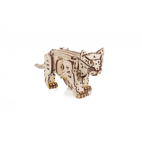 Wooden mechanical construction kit with a spring motor. Once you assemble this cute kitten, you can wind it up, and it will start walking as if it were a real live kitten!