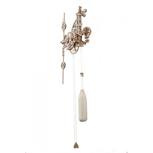 Šis laikrodis veikia be baterijų – jį varo gravitacija. Užtenka surinkti detales be klijų, pakabinti ant sienos, užkelti svorį, ir laikrodis pradės gyventi savo ritmu. Kiekvienas krumpliaratis, svirtis ir pendelis juda harmoningai, kurdamas magišką tikrojo laiko pojūtį.