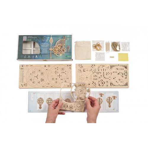 Modelį sudaro 320 tiksliai lazeriu išpjautų detalių, kurios jungiasi tarpusavyje be klijų. Surinkimo procesas – tai kantrybės, kūrybos ir mechanikos pažinimo kelionė. Galutinis rezultatas – įspūdingi mediniai laikrodžiai, kurie ne tik rodo laiką, bet ir tampa tavo interjero akcentu.