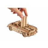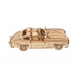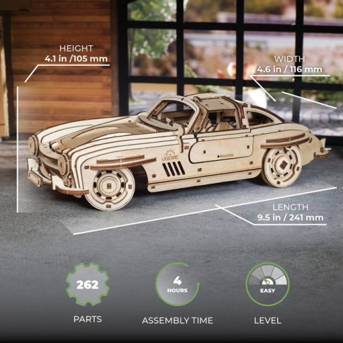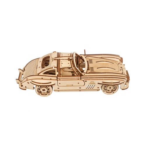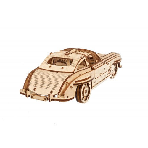 „Ugears“ sparnuotas sportinis kupė leidžia svajoti apie svajonę nesulaužant banko. Trečiasis automobilis Dual Motors kolekcijoje, šis grakštus 1:24 mastelio modelio kupė turi 2 veikimo režimus: apvyniokite automobilį reketo raktu, esančiu po nuimama važiuokle, arba patraukite automobilį atgal lygiu paviršiumi ir atleiskite. Automobilyje taip pat yra gaubtas, kuris pakeliamas, kad atskleistų modelio variklį. Pagaminta iš meno kokybės kompozitinių medienos dalių, kurias išmušate iš lazeriu išpjautų lentų, žaislinis automobilis turi nuostabų natūralaus medžio aromatą ir natūralaus medžio pojūtį. Kaip ir visuose Ugears modeliuose, rekomenduojame nušlifuoti visas kompozitinių medienos gabalų šlifuokles, vaškuoti ir „išvystyti“ judančias dalis, kai jos surenkamos, kol krumpliaračiai ir kitos judančios dalys pradės veikti sklandžiai.