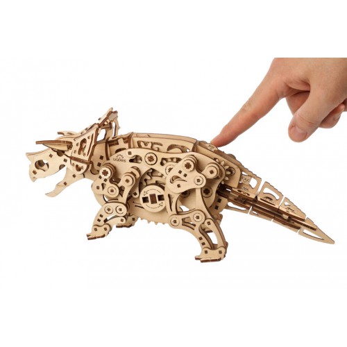 UGEARS Triceratops – 1:32 mastelio medinis dinozauras-automatas, varomas metaline spyruokle. Surinkus, jis vaikšto, judina uodegą ir krapšto žandikaulį – puikus iššūkis meistrams ir originali dovana dinozaurų mėgėjams.