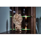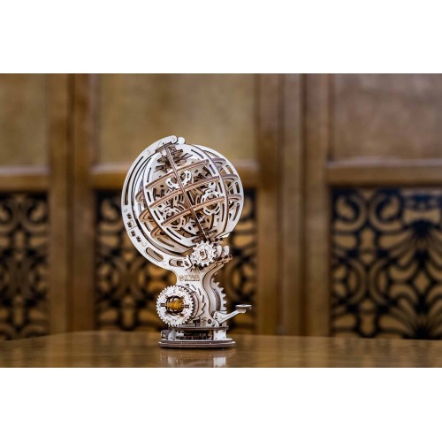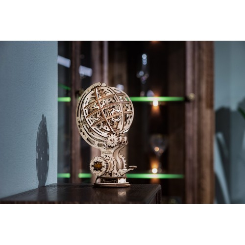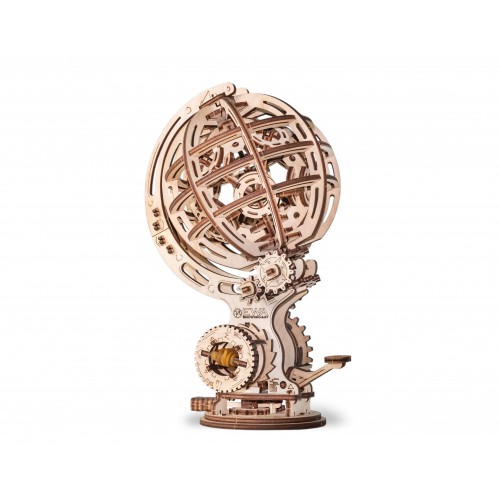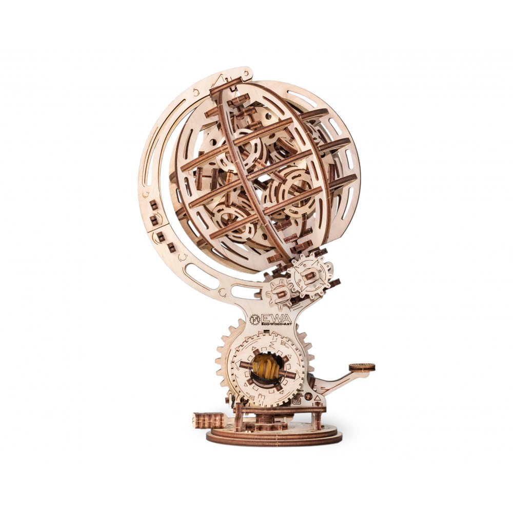 Механическая 3D-модель. Геометрическая изящность, художественно совмещенная с гармонично расположенными подвижными элементами, в сочетании с механизмом заводки создает для этой модели незабываемый и таинственный образ, который будет великолепно восприниматься в любом интерьере. Искусно выполненный экологичный резиномотор, дополненный механизмом запуска и остановки, приводит в движение полупрозрачную сферу и множество шестеренок, которые в совокупности символизируют силу Земли, природы, энергии и механики. Модель предназначена для самостоятельной сборки без клея и доставит массу удовольствия как детям, так и взрослым.